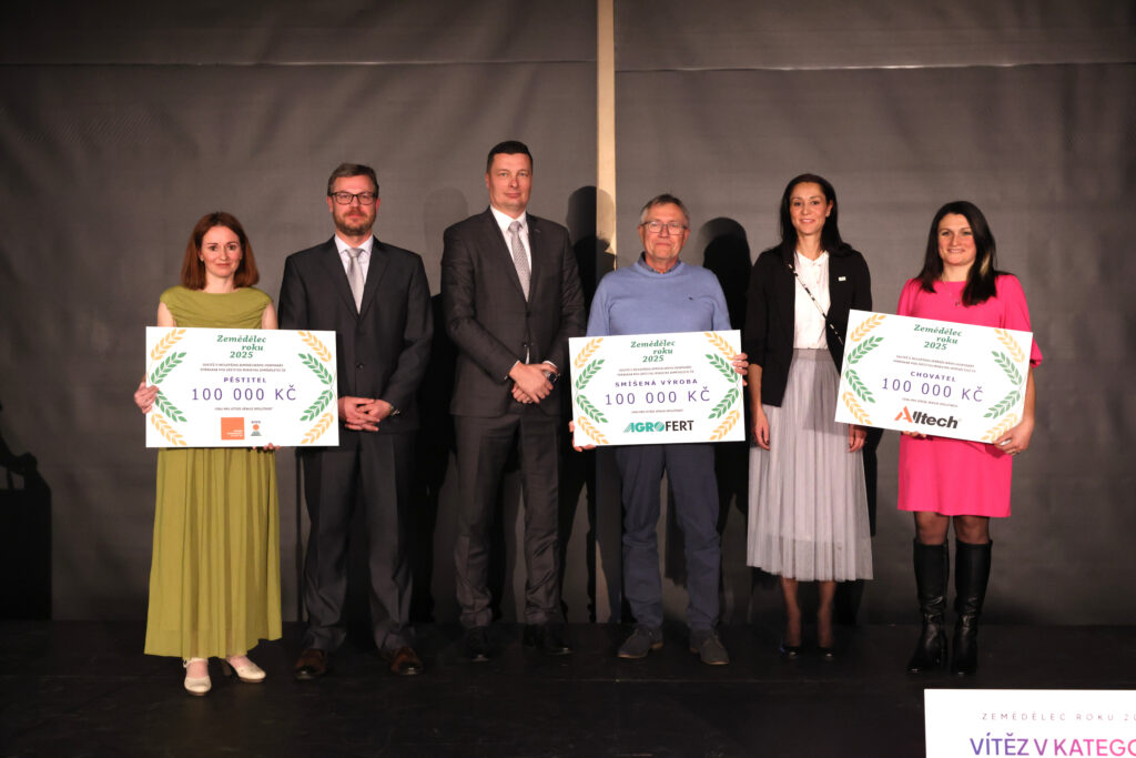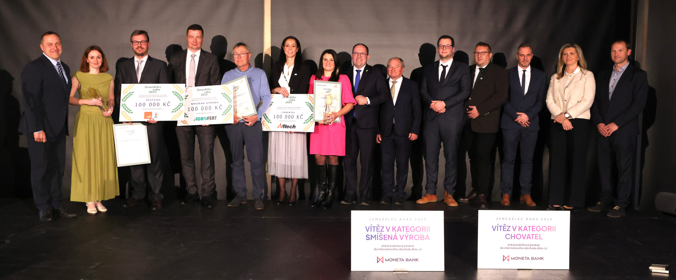 Tři hlavní vítězové letošního ročníku soutěže Zemědělec roku se zástupci sponzorů a pořadatelů: ředitel vydavatelství Profi Press Martin Sedláček (zleva), jednatelka Farmy Želeč Michaela Hanzalová, marketingový manažer společnosti KWS Osiva s. r. o., Roman Olšanský, ředitel zemědělské divize koncernu Agrofert a. s. Milan Škvor, Lubomír Vítek, který převzal cenu pro nejlepšího zemědělce se smíšenou výrobou, zástupkyně společnosti Alltechnology CZ, s. r. o., Alexandra Kapounová, Dagmar Nosková Pitrmucová, která převzala ocenění Zemědělec roku v kategorii nejlepší chovatel, ministr zemědělství v demisi Marek Výborný, viceprezident Agrární komory ČR a předseda představenstva Regionální agrární komory Jihomoravského kraje Václav Hlaváček, prezident Společnosti mladých agrárníků ČR David Brož, předseda Českomoravského svazu zemědělských podnikatelů Jiří Michalisko, ředitel Ústavu zemědělské ekonomiky a informací Štěpán Kala, manažerka pro sektor zemědělství Moneta Money Bank Barbora Kobiánová a produktový manažer pojištění plodin společnosti Generali Česká pojišťovna Martin Bělina